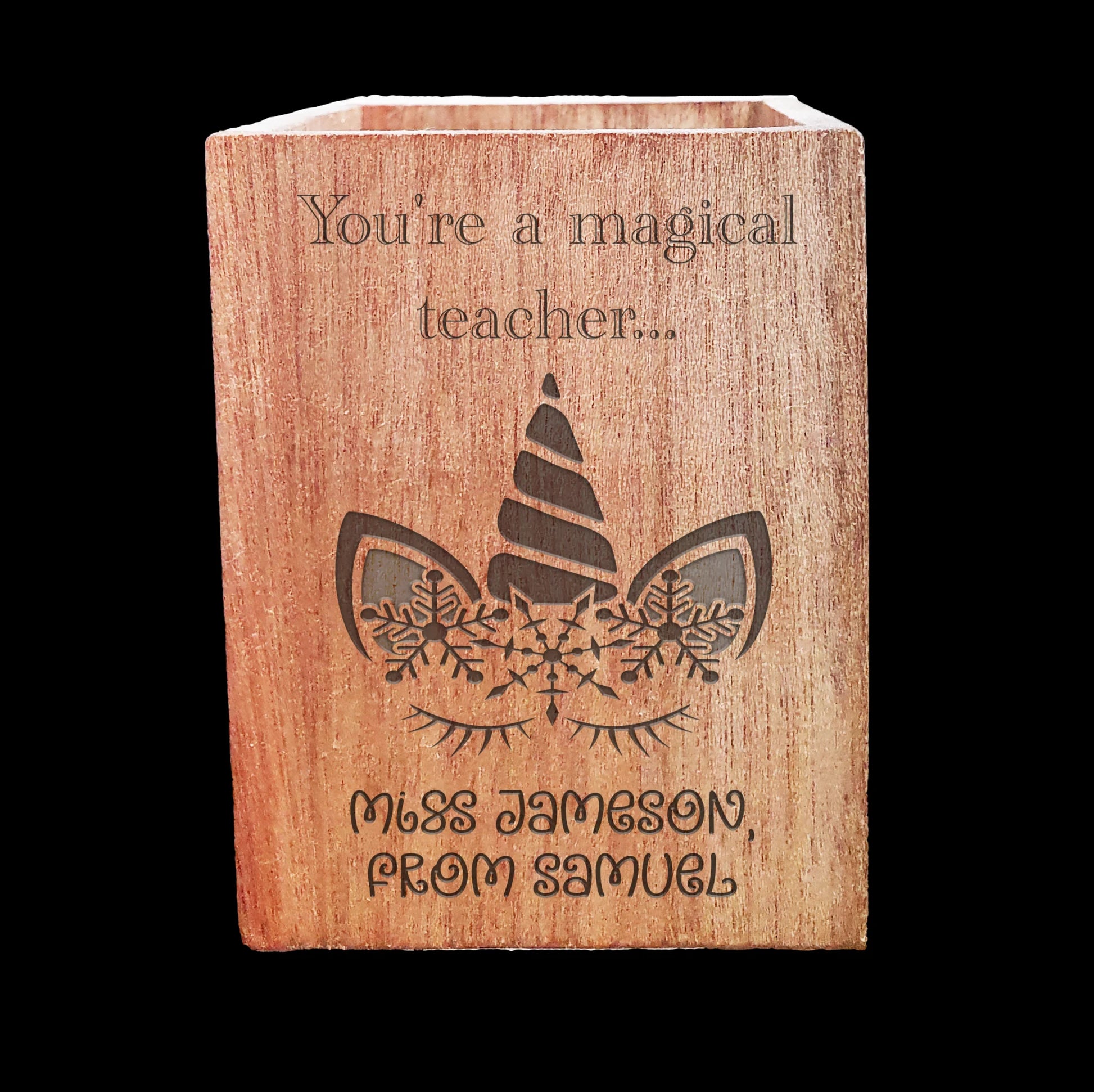 Measuring 90mm wide x 90mm deep x 120mm high, itâs the perfect size for pens, pencils, and all those little classroom essentials. đ Add a personal touch with the teacherâs name and studentâs name expertly laser engraved on the front â a heartfelt keepsake thatâll be cherished long after the last bell rings. đ